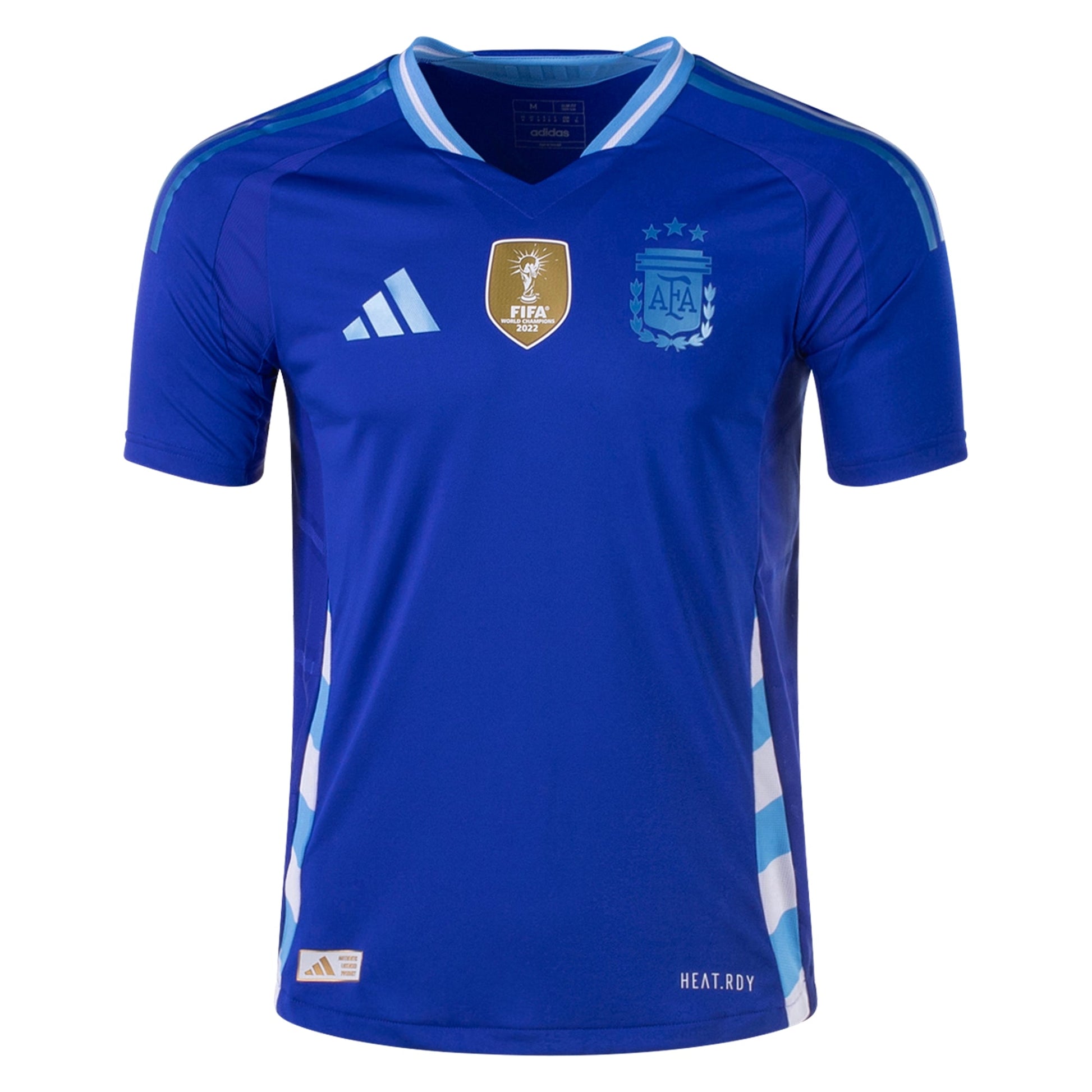 This refresh on Argentina’s away jersey uses royal blue to welcome in the new sets of fans following the La Albiceleste, while still maintaining some subtle nods to the home top’s and country flag’s iconic designs with blue and white stripes. The metallic finishes and graphic inserts on this jersey top off what’s a sublimated, yet statement look for Argentina’s away days at Copa and beyond.